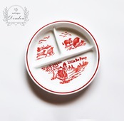Fire-Kingとは異なり、Vitrockは磁器のような真っ白でつややかなオパールガラスが特徴のシリーズです。こちらは1940年代に製造された「Little Bo Peep」デザインで、イギリスの童謡に登場する羊飼いの少女をモチーフにしています。プレート中央には愛らしい少女と羊たちのイラストが描かれ、まるで絵本のワンシーンのよう。特にこちらの赤一色で描かれたタイプは現存数が少なく、希少とされています。